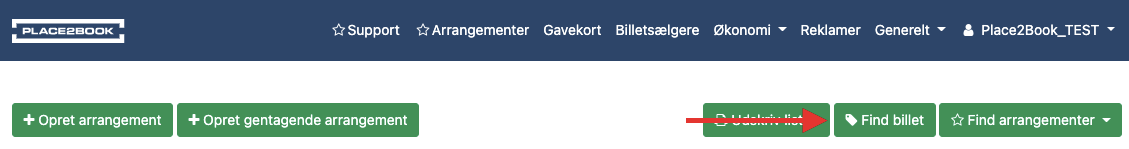 På oversigtsiden for arrangementer er der her en knap kaldet "Find billet".