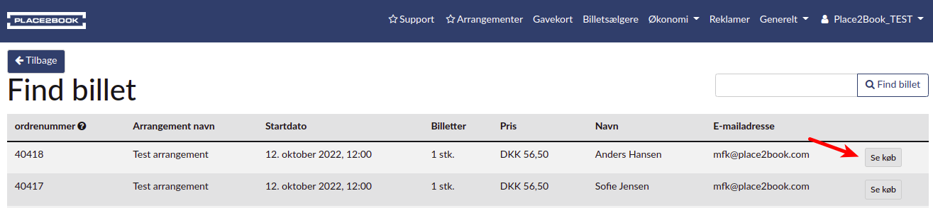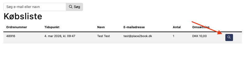 Ved at klikke på "Se køb" til højre for den indtastede, så bliver man sendt videre til ordren for billetkøberen.