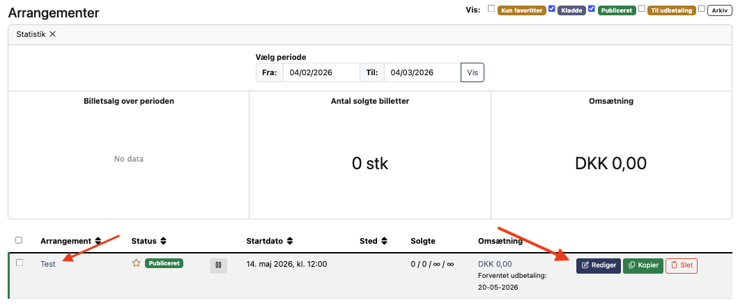 | Først skal arrangementet findes, hvorefter man skal ind på selve arrangementet. Dette kan gøres ved at klikke på enten den blå tekst med titlen til venstre, eller knappen "Rediger". Som fremvist på billedet til højre. | ![]() |