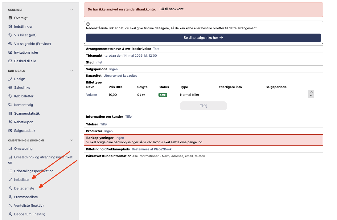 | Når man er inde på arrangementet, kan Deltager- eller Købslisten findes i den grå boks til venstre. | ![]() |