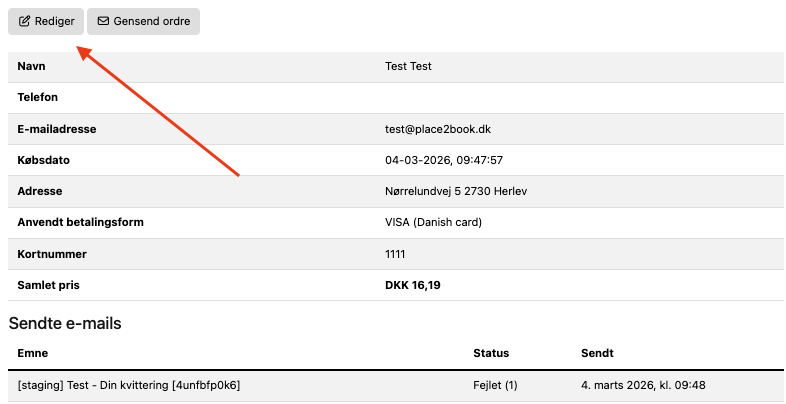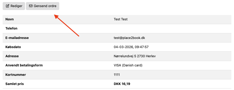 Hvis det ønskes, at kunne gensende en ordre grundet ændret informationer, eller billetkøber ikke kan finde sine billetter, så kan knappen "Gensend ordre" benyttes:
