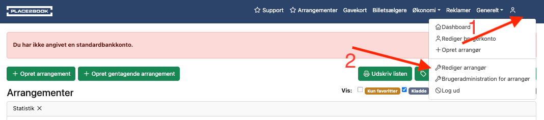 - For at sikre, at arrangørens oplysninger samt de informationer, som billetkøberne skal kunne se, er korrekte, skal man tilgå redigering af arrangøren. Her kan guiden Redigering af arrangør anvendes for at finde frem til denne indstilling.