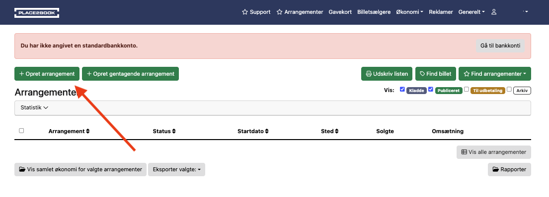 På arrangementoversigten er der endnu ingen arrangementer oprettet, og oversigten er derfor tom. Det første arrangement kan oprettes ved hjælp af den grønne knap (oprettelse af gentagende arrangementer beskrives længere nede i artiklen), som vist på billedet nedenfor med den røde pil.