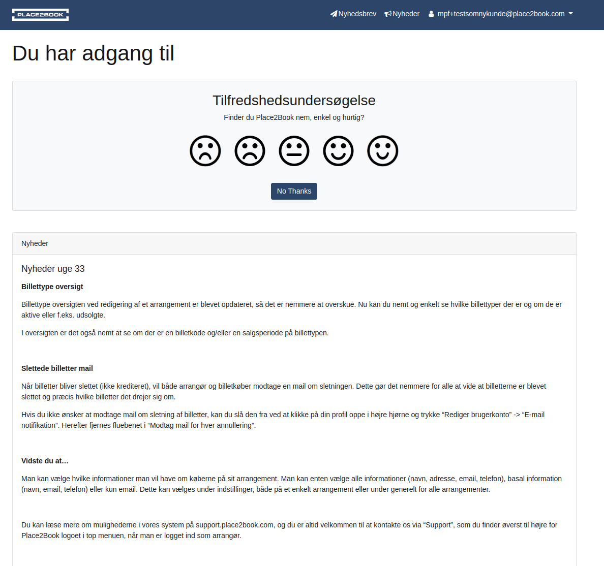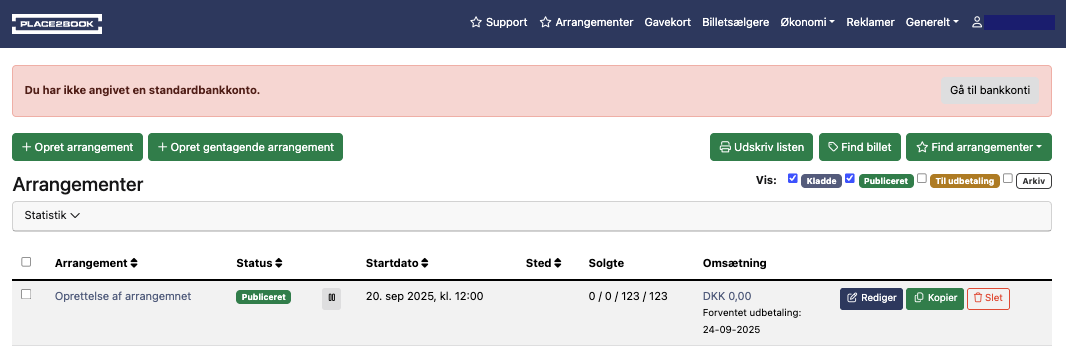 - Periode arrangement - Som er billetter som er gyldige inden for en hvis periode. Denne funktion er nyttig til eksempelvis museumsbilletter. Se en grundigere beskrivelse: https://support.place2book.com/support/solutions/articles/80001042062-periode-arrangement