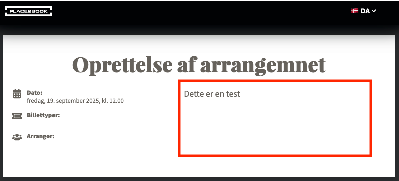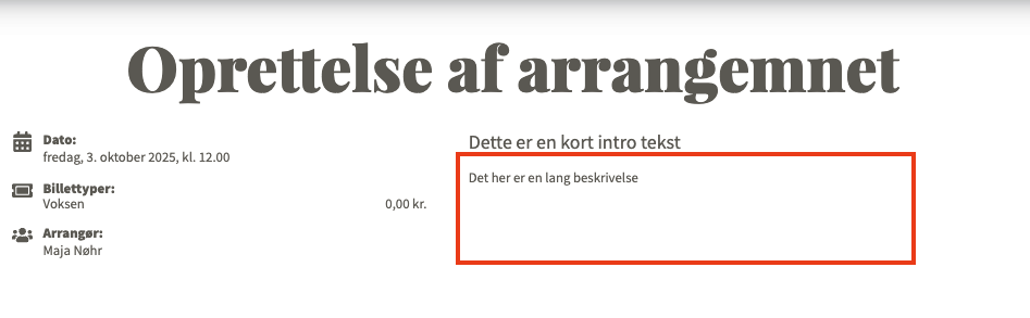 Derudover er det nu muligt at tilføje en længere beskrivelse af arrangementet. Til højre vises, hvordan beskrivelsen vil fremstå på salgssiden. Indstillingen kan ændres når som helst. | ![]() |