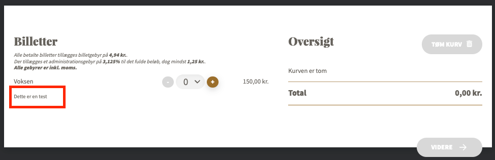 | Pop op menu - Kort intro tekst Den korte tekst kan indeholde maksimalt 250 tegn og vises i højre side af informationssiden for billetkøberne (se billede nedenfor). Denne indstilling kan ændres når som helst. | ![]() |