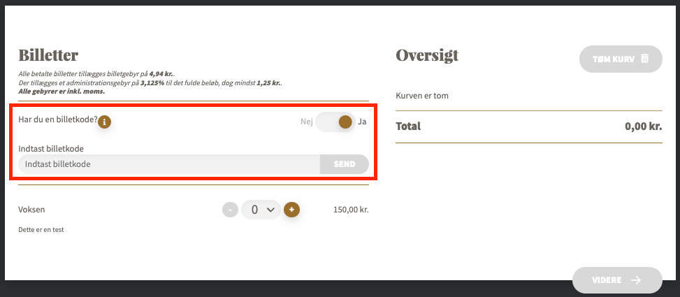 | Pop op menu - Billetkode Ønskes en billettype oprettet med en tilhørende kode, kan billetkoden benyttes. Yderligere information om billetkoder kan findes her: Denne indstilling kan altid ændres. | Her er eksemplet tjekket af som værende "Ja", dette er et aktivt valg for billetkøberen. |