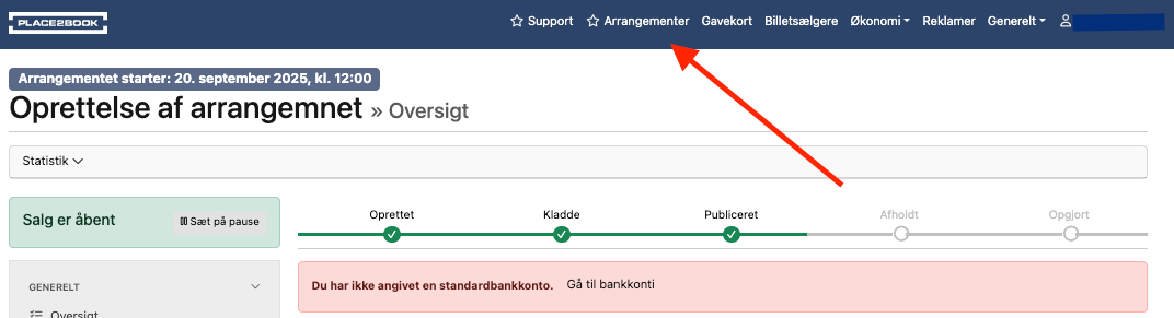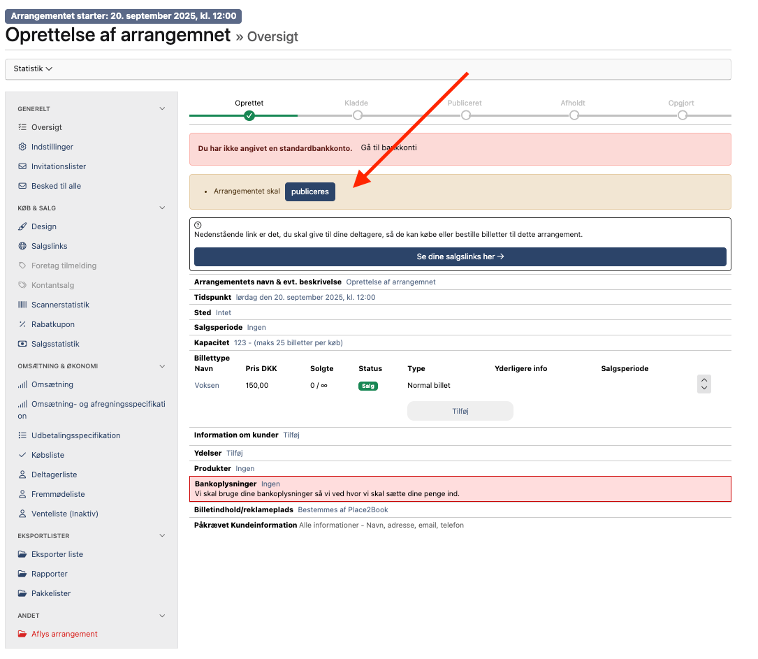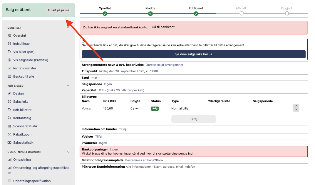 Billetsalget kan nu startes ved hjælp af knappen Publiceres. Status for salget vises i øverste venstre hjørne, hvor det også er muligt at sætte salget på pause.