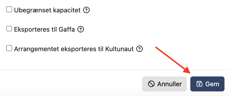 Alternativt kan checkboxen Ubegrænset kapacitet benyttes, hvilket betyder, at arrangementet kan have et ubegrænset antal billetter til salg.