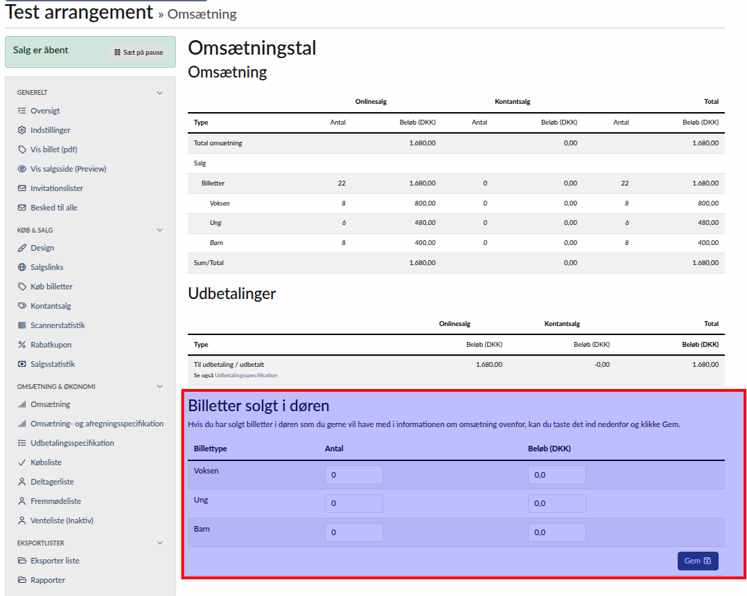 Her kan du indsætte dit yderligere salg på arrangementet, for hver billettype.